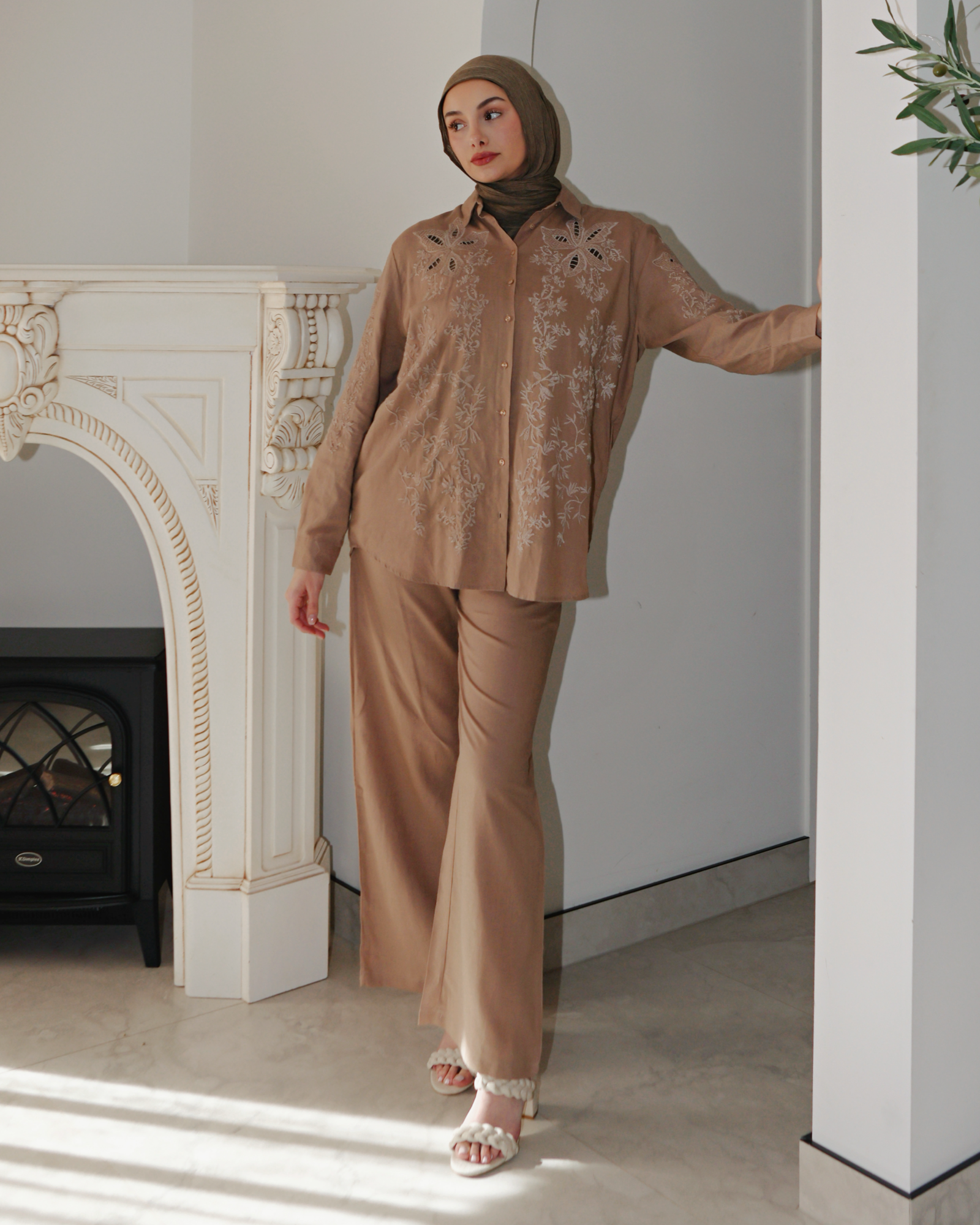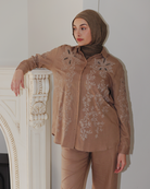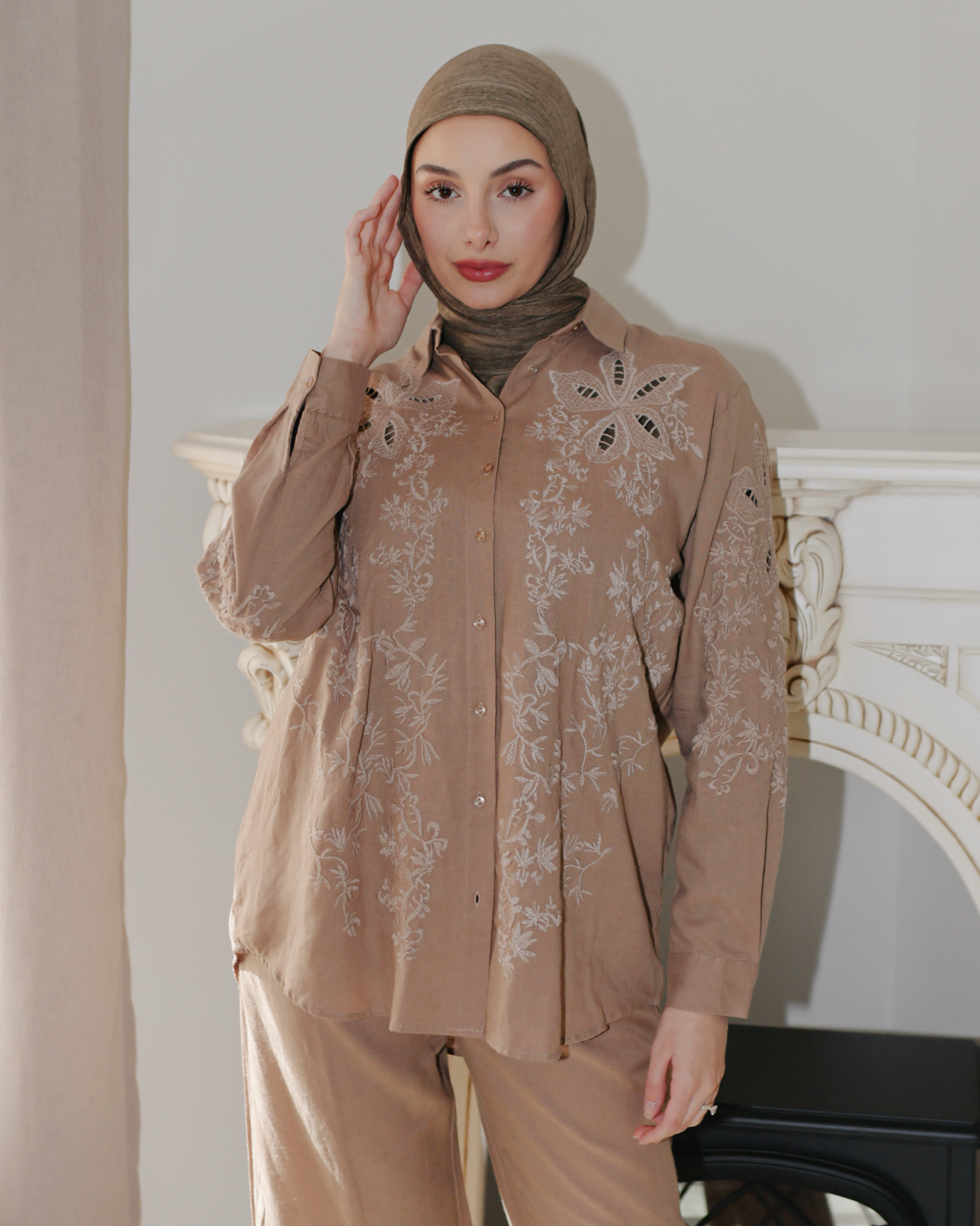A graceful co-ord set that blends softness with elegance. The Amara Set features a lightweight embroidered button-down top with floral cutout details and matching elastic-cuff trousers. Delicate yet wearable, it's your new go-to for modest statement styling.