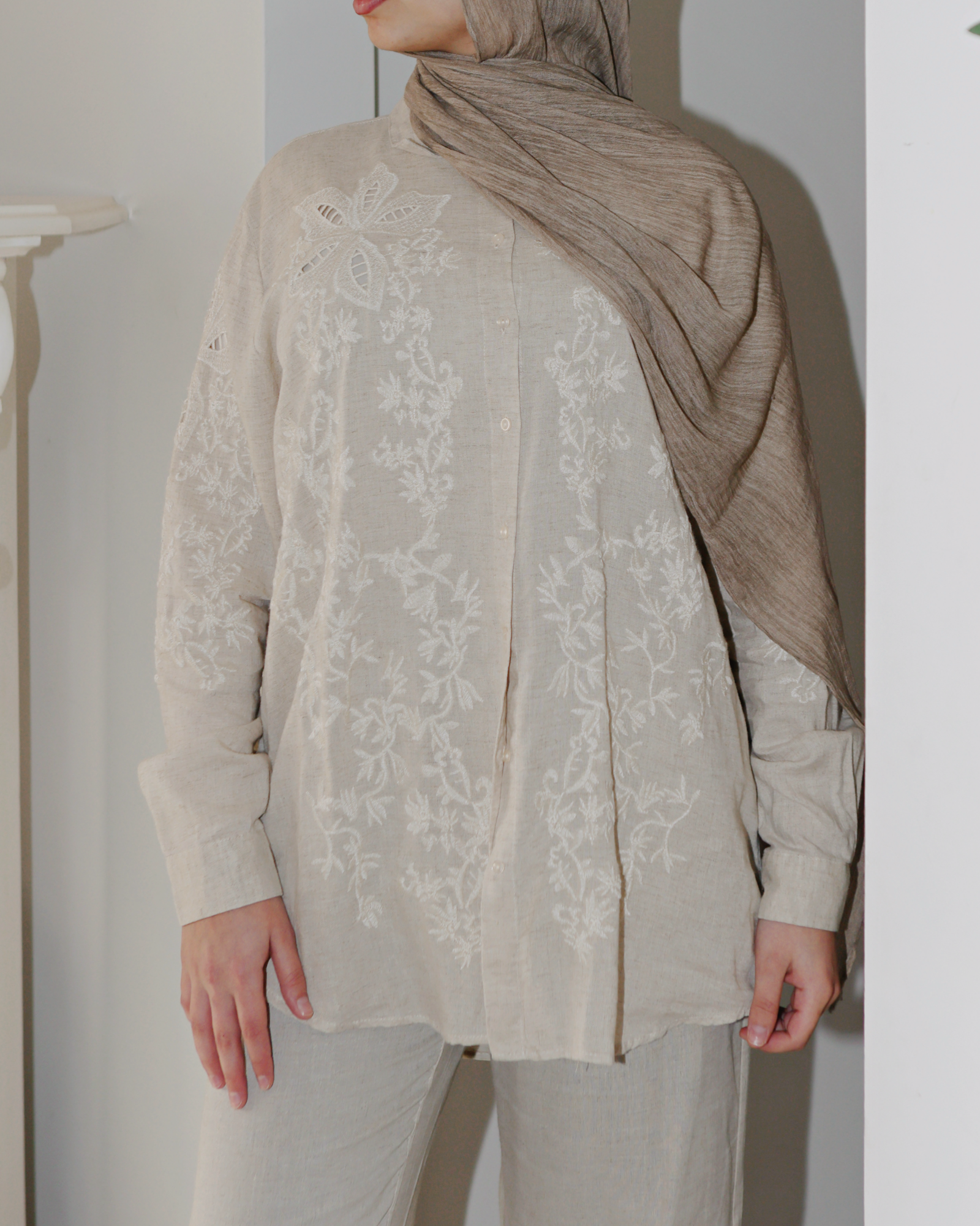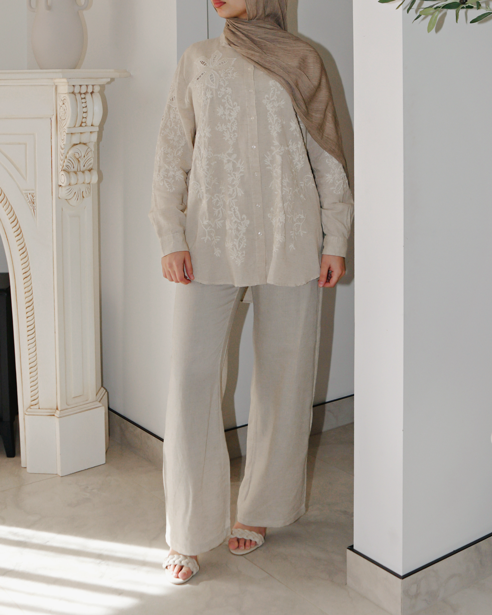 A graceful co-ord set that blends softness with elegance. The Amara Set features a lightweight embroidered button-down top with floral cutout details and matching elastic-cuff trousers. Delicate yet wearable, it's your new go-to for modest statement styling.