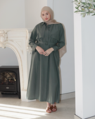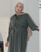 The Darine Dress blends structure with grace in a trench-inspired silhouette. Featuring a crisp collar, belted waist, and a bold layered flap over the bodice, this piece gives you a confident, composed look. Ideal for elevating everyday style with a modest twist.