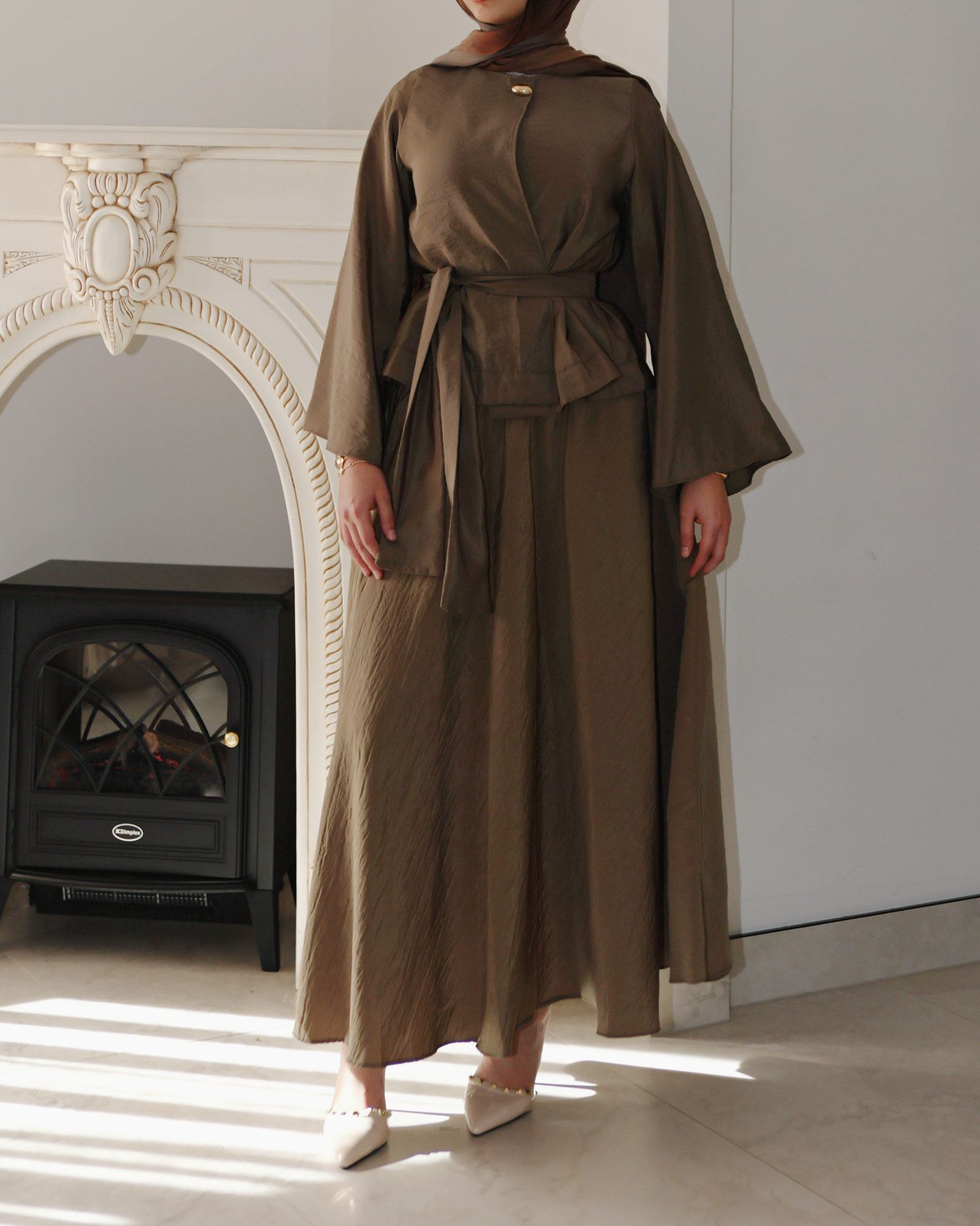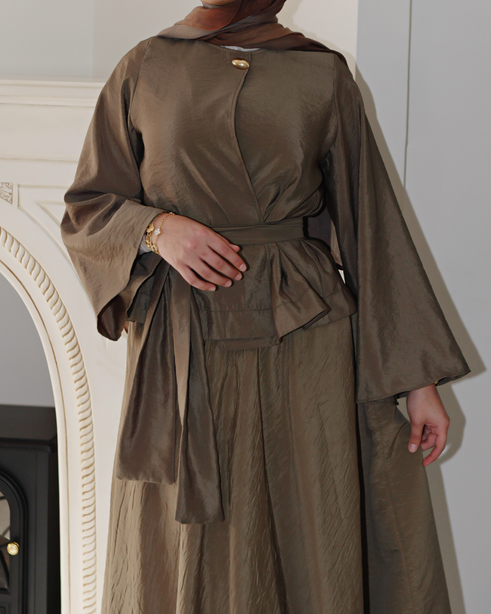 The Mahira Set embodies effortless grace with its structured peplum top and flattering waist belt. Featuring a bold statement button, this set pairs modern style with modest elegance. The flowing skirt adds the perfect feminine touch, making it ideal for day or night.