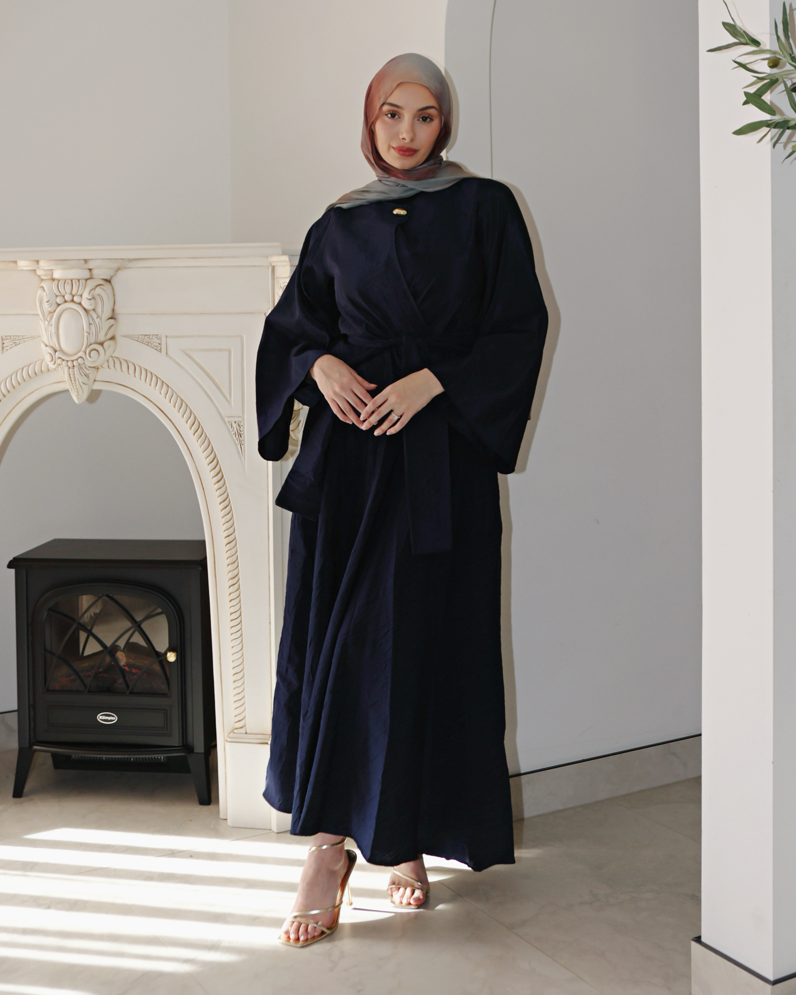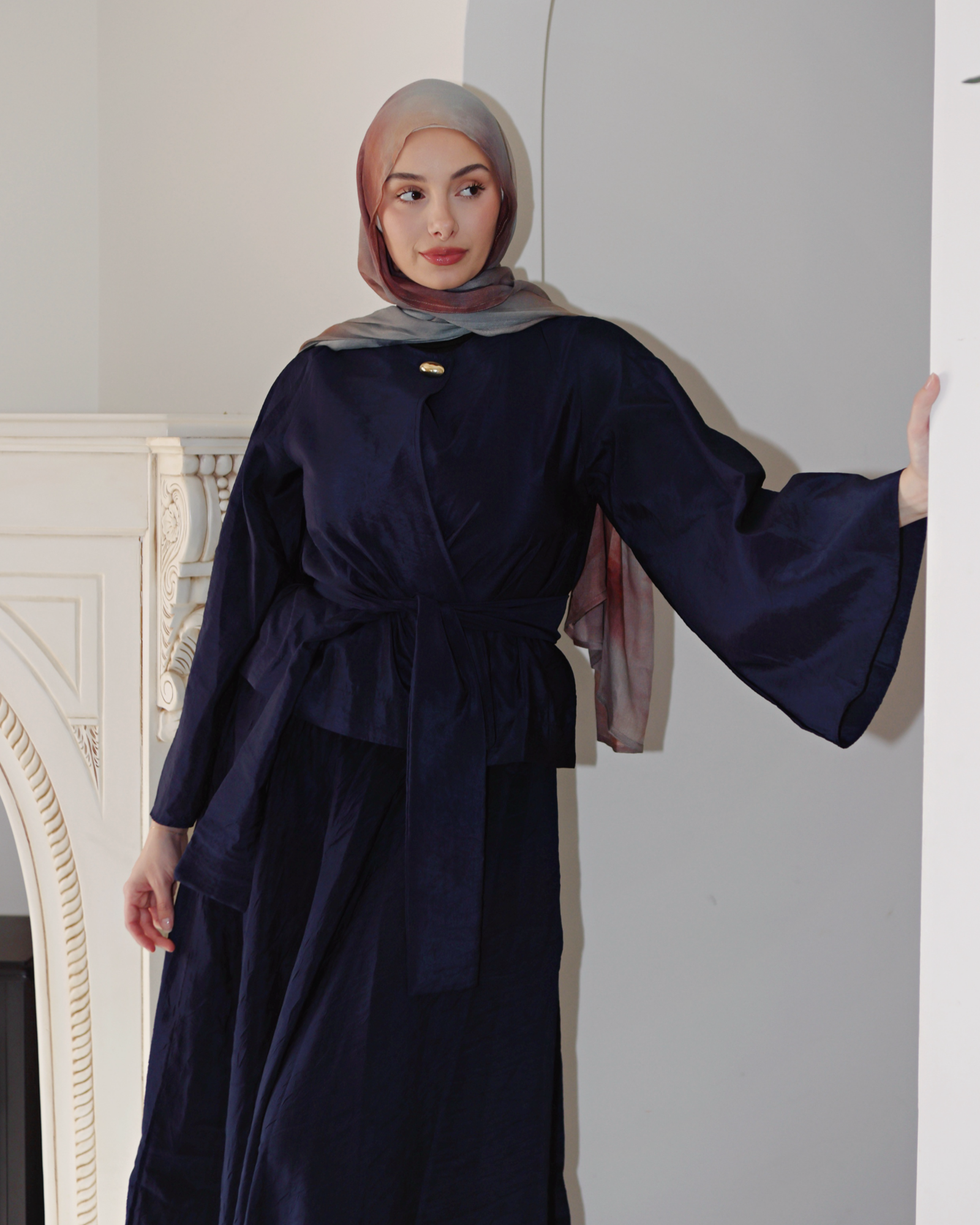 The Mahira Set embodies effortless grace with its structured peplum top and flattering waist belt. Featuring a bold statement button, this set pairs modern style with modest elegance. The flowing skirt adds the perfect feminine touch, making it ideal for day or night.