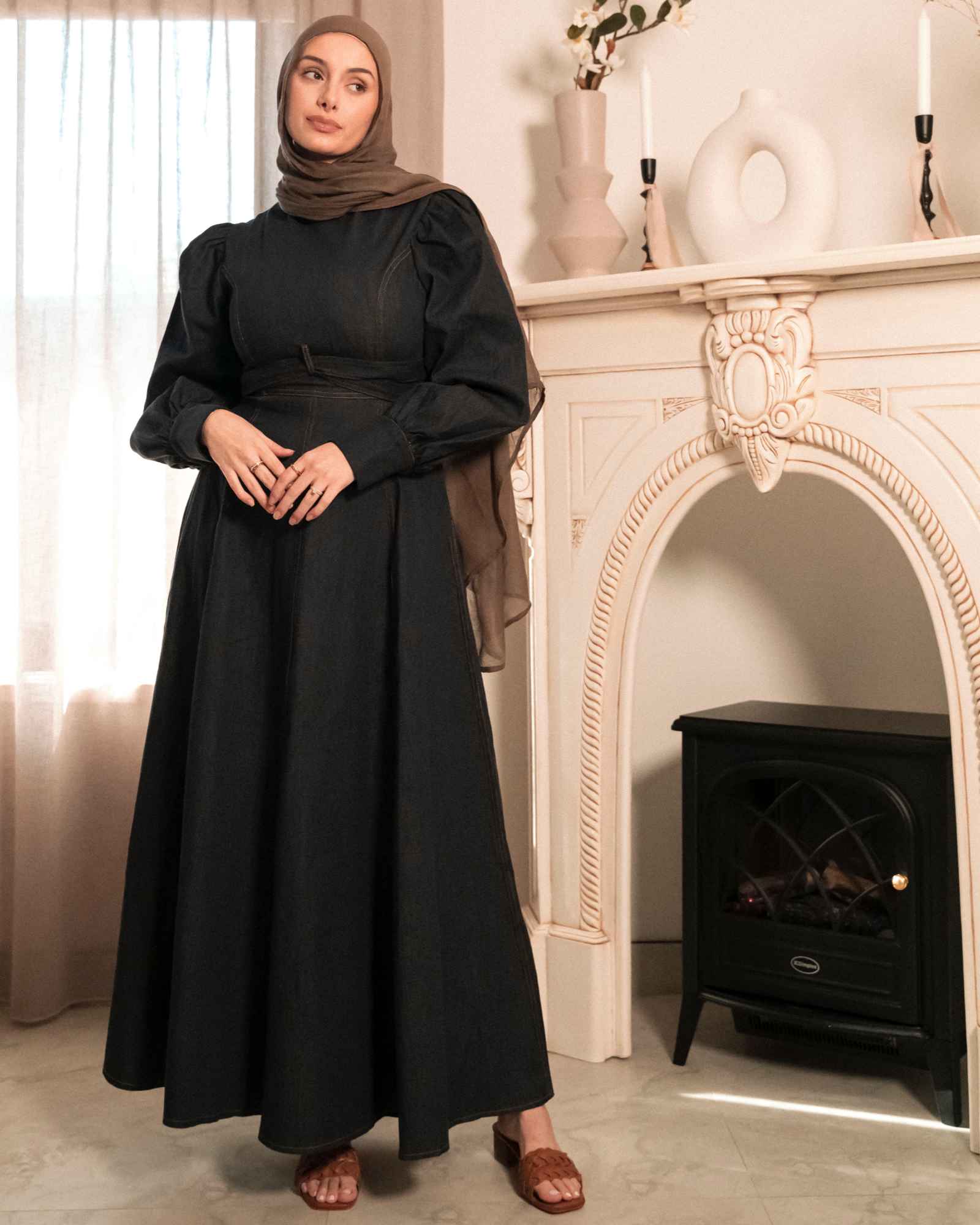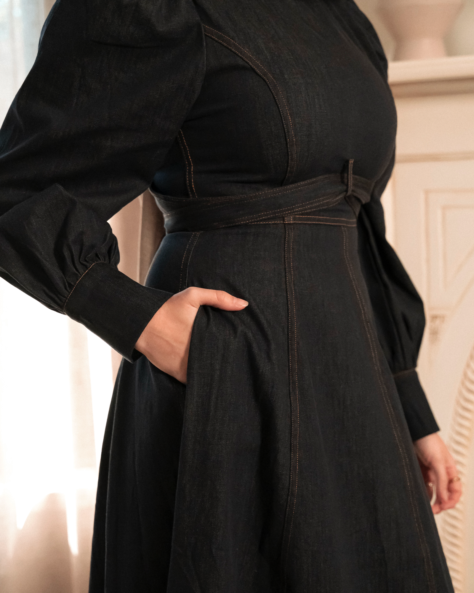 A modest piece crafted in dark denim. This dress features puffed sleeves and a cinched waist for a refined silhouette. The standout detail is the elegant wraparound tie that crosses over the shoulders and cinches at the back, adding definition and subtle drama to the design.