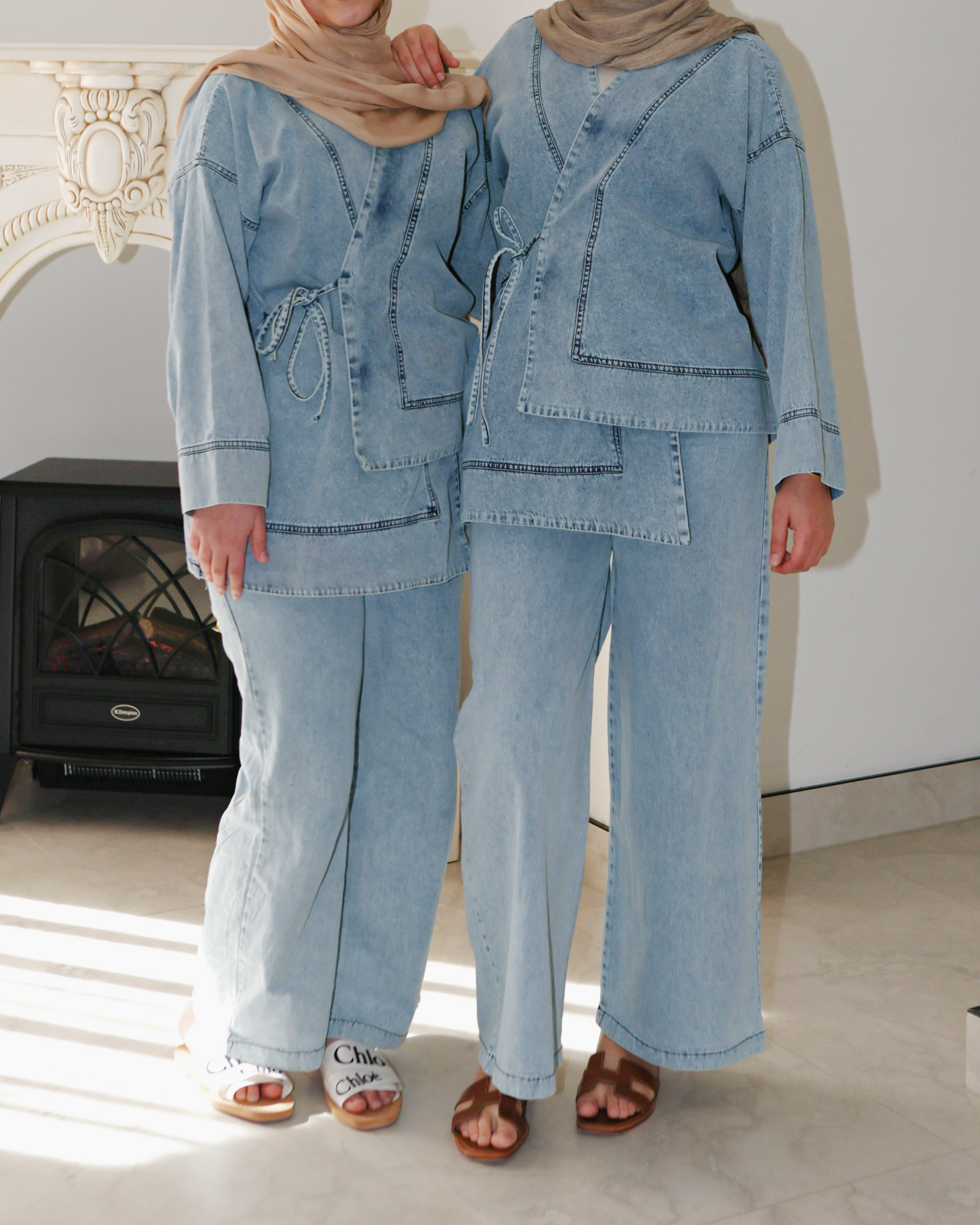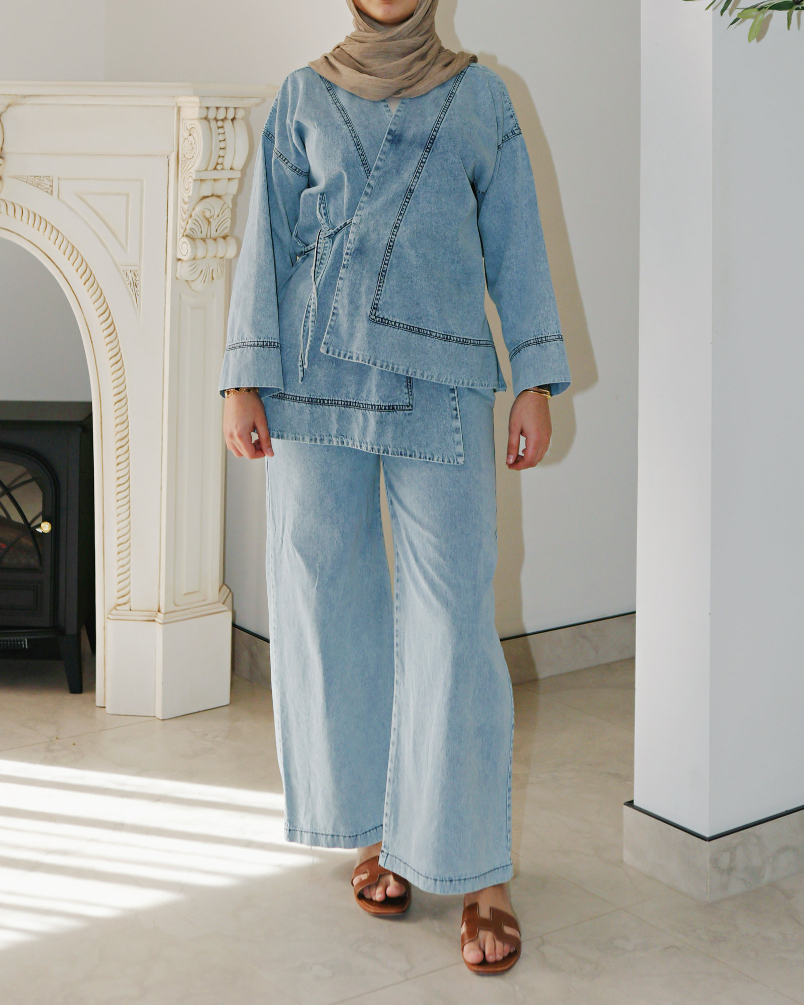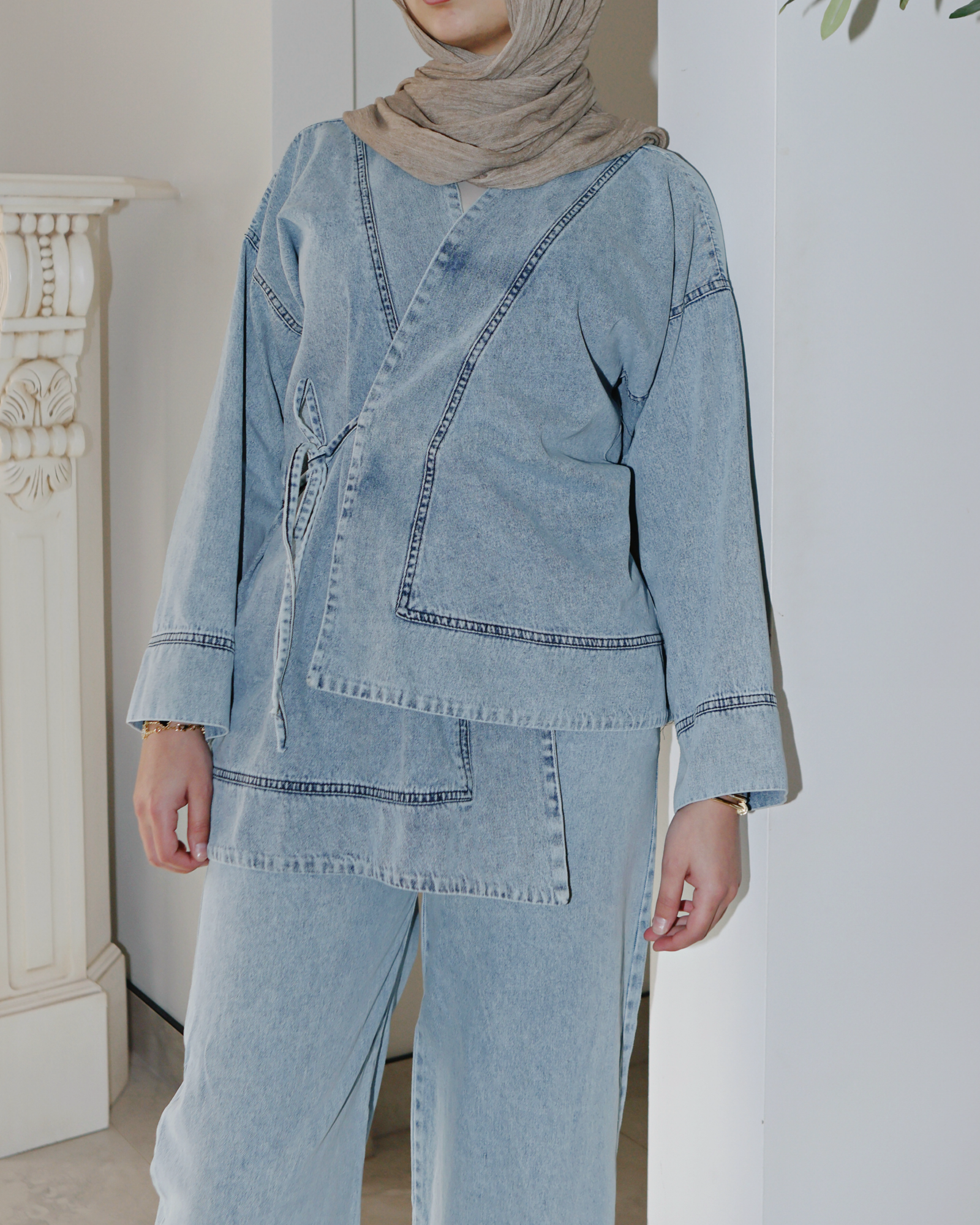 The Safiyah Set blends minimal design with unique structure. Made from soft, light-wash denim, this two-piece features a wrap-style top with an uneven asymmetrical hem and tie closure that adds subtle dimension to the silhouette. The pants are relaxed with elastic cuffs, offering comfort without compromising style. A clean, versatile look for effortless everyday dressing.