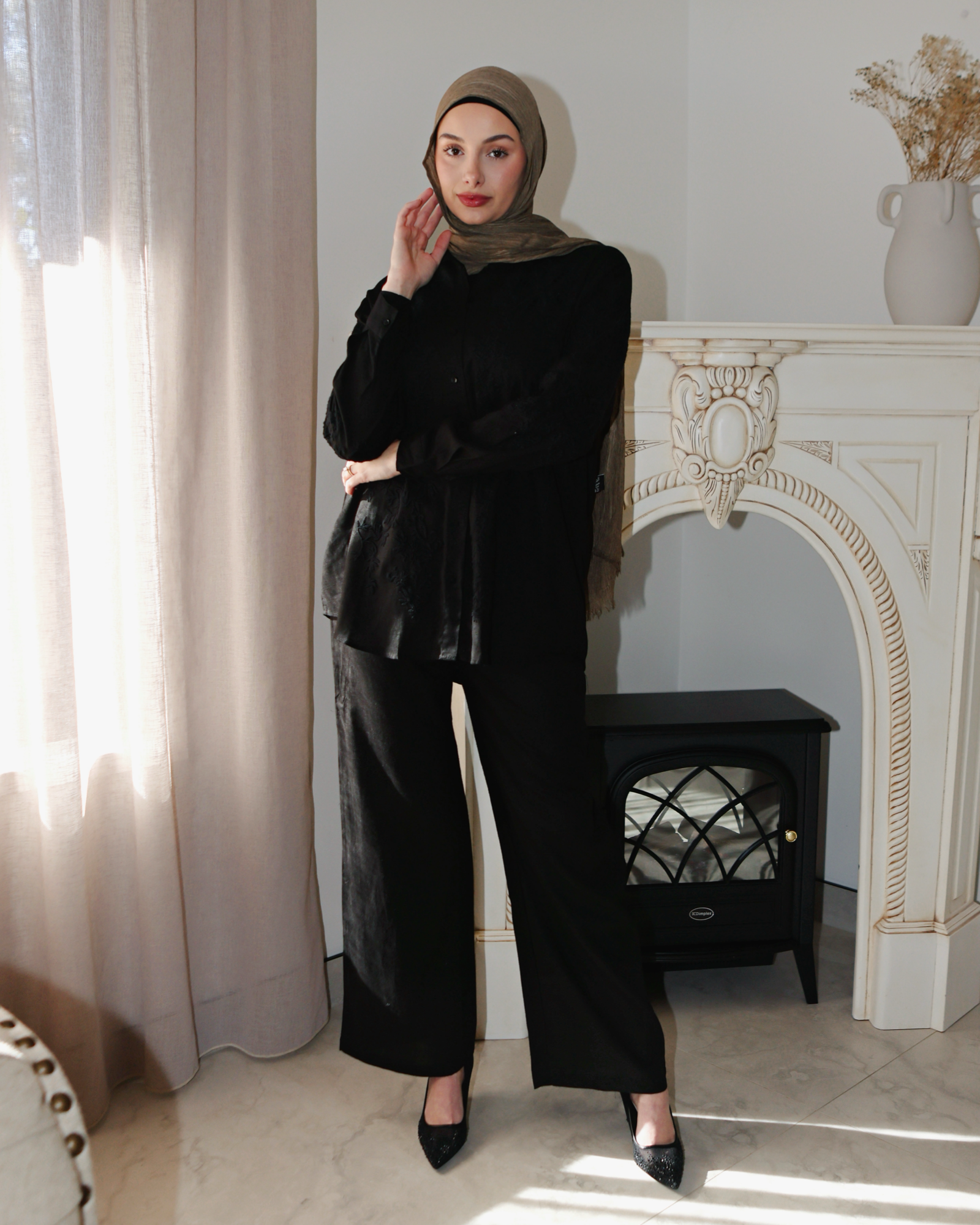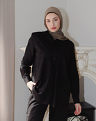 A graceful co-ord set that blends softness with elegance. The Amara Set features a lightweight embroidered button-down top with floral cutout details and matching elastic-cuff trousers. Delicate yet wearable, it's your new go-to for modest statement styling.