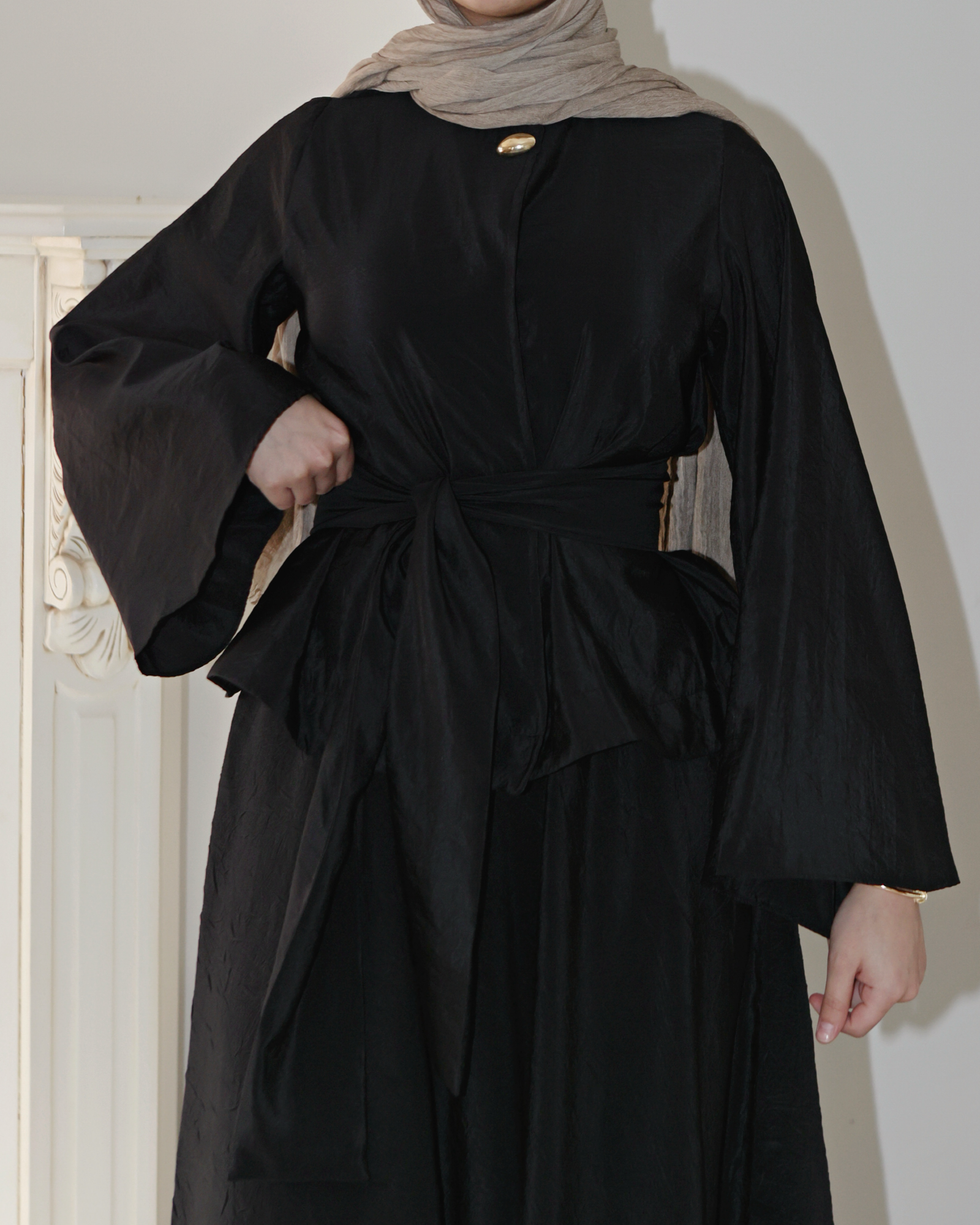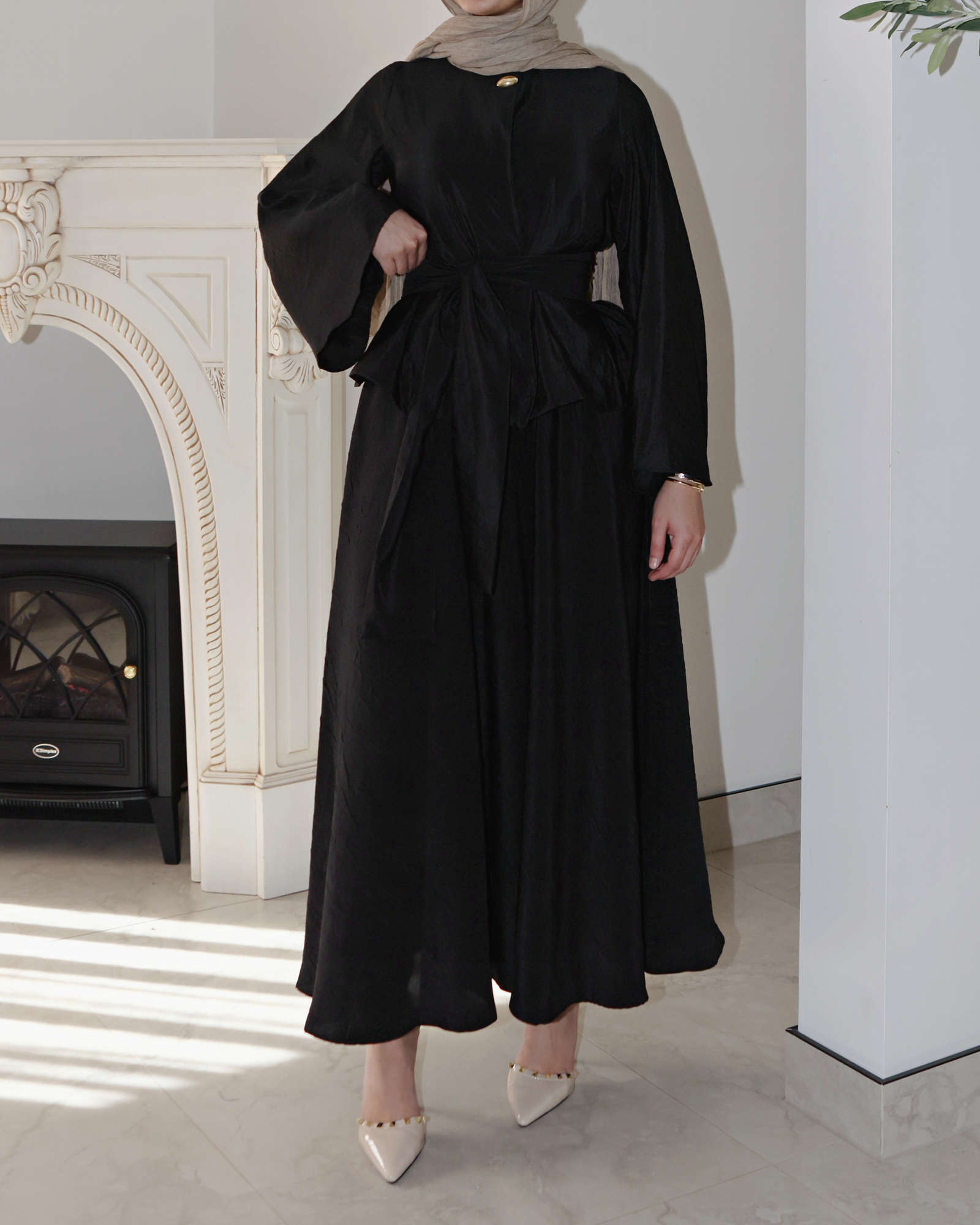 The Mahira Set embodies effortless grace with its structured peplum top and flattering waist belt. Featuring a bold statement button, this set pairs modern style with modest elegance. The flowing skirt adds the perfect feminine touch, making it ideal for day or night.