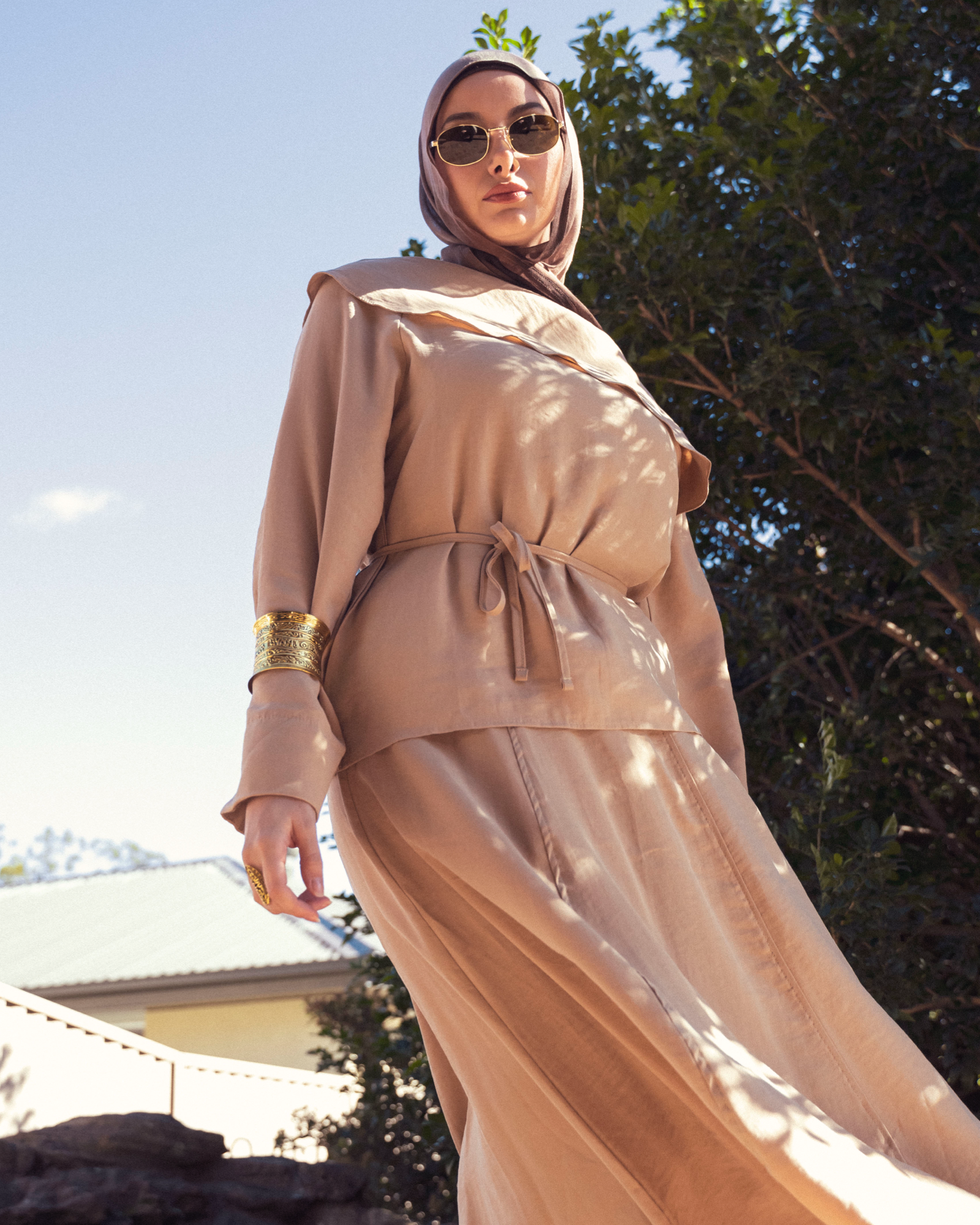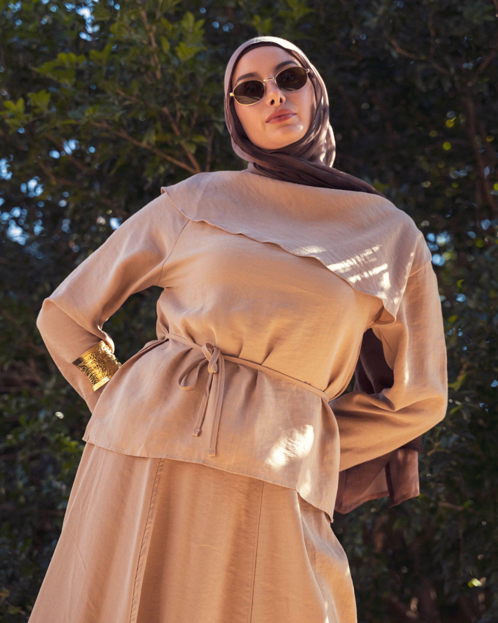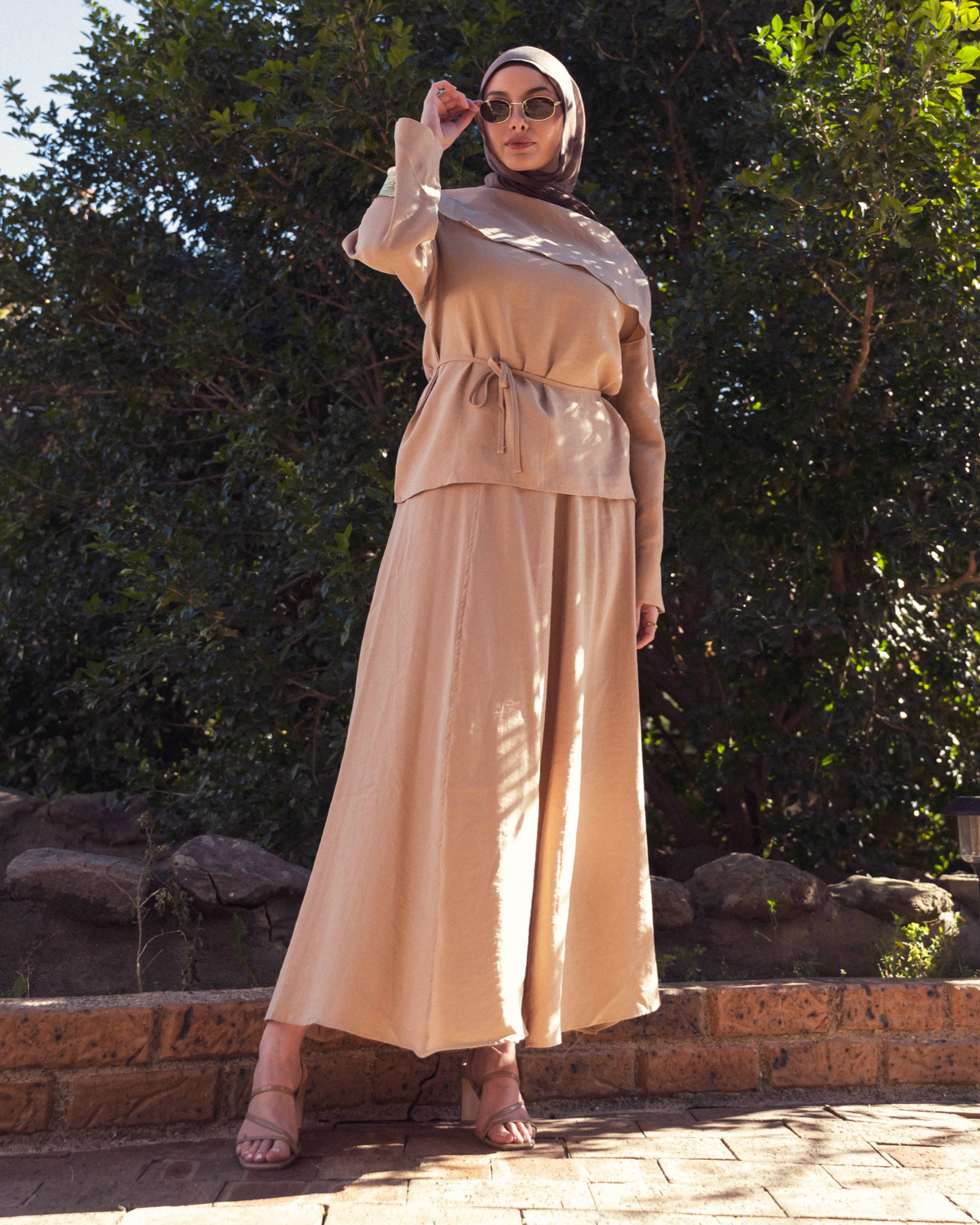 The Raneem Set flows like a soft melody. This two-piece ensemble features a full-length skirt and an asymmetrical top with a shoulder overlay, tied gracefully at the waist. The natural fabric and neutral tone give it effortless charm perfect for modern elegance with subtle statement.