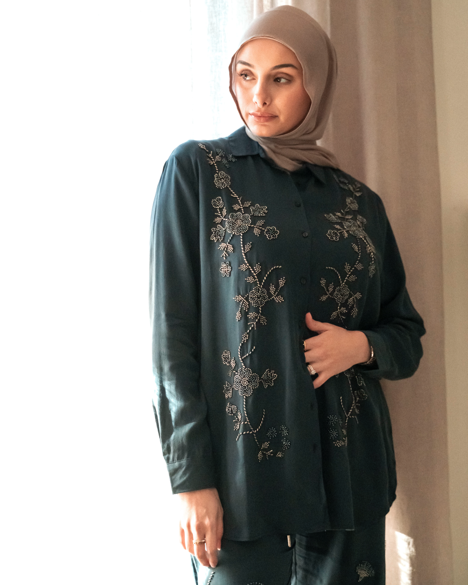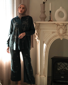 The Jenan Set is a floral dream brought to life in fabric. Featuring delicately beaded embroidery in a symmetrical vine layout, this flowy two-piece offers a timeless shirt silhouette with coordinating drawstring pants. A soft shimmer in the fabric makes it ideal for dressy days and elegant evenings.